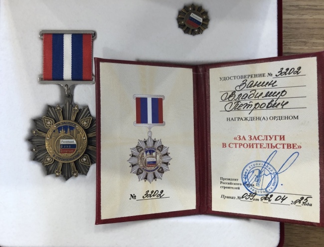 Орден «За заслуги в строительстве» Занину Владимиру Петровичу, генеральному директору АО "СЗ "Пермглавснаб", за многолетний добросовестный труд и в связи с юбилеем