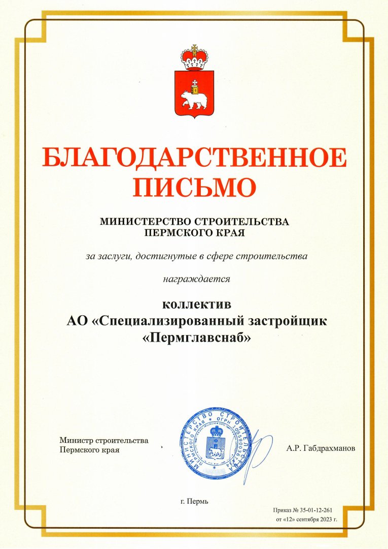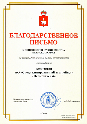Благодарственное письмо Минстроя ПК коллективу АО "СЗ "Пермглавснаб" за заслуги, достигнутые в сфере строительства. 2023